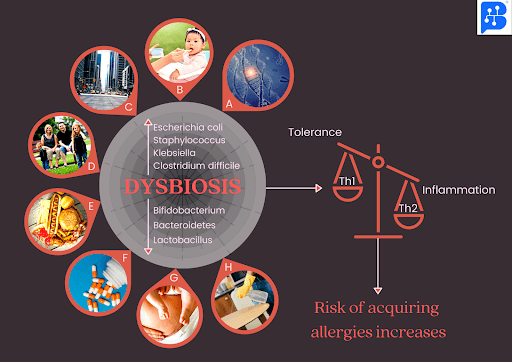 Factors responsible for changes in the normal gut flora, leading to dysbiosis which in turn increases the risk of acquiring allergic diseases :- A. Genetics ; B. Less breastfeeding ; C. Transition from rural to urban and suburban living (less contact with nature) ; D. Smaller families ; E. High fat, low fibre diet ; F. Antibiotics ; G. More cesarean sections ; H. Over-sanitization