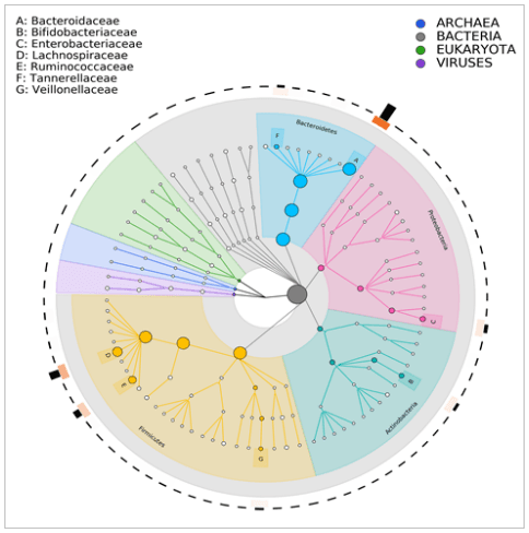 Let’s try to read one such annotated cladogram representing microbial composition of a human gut sample.
