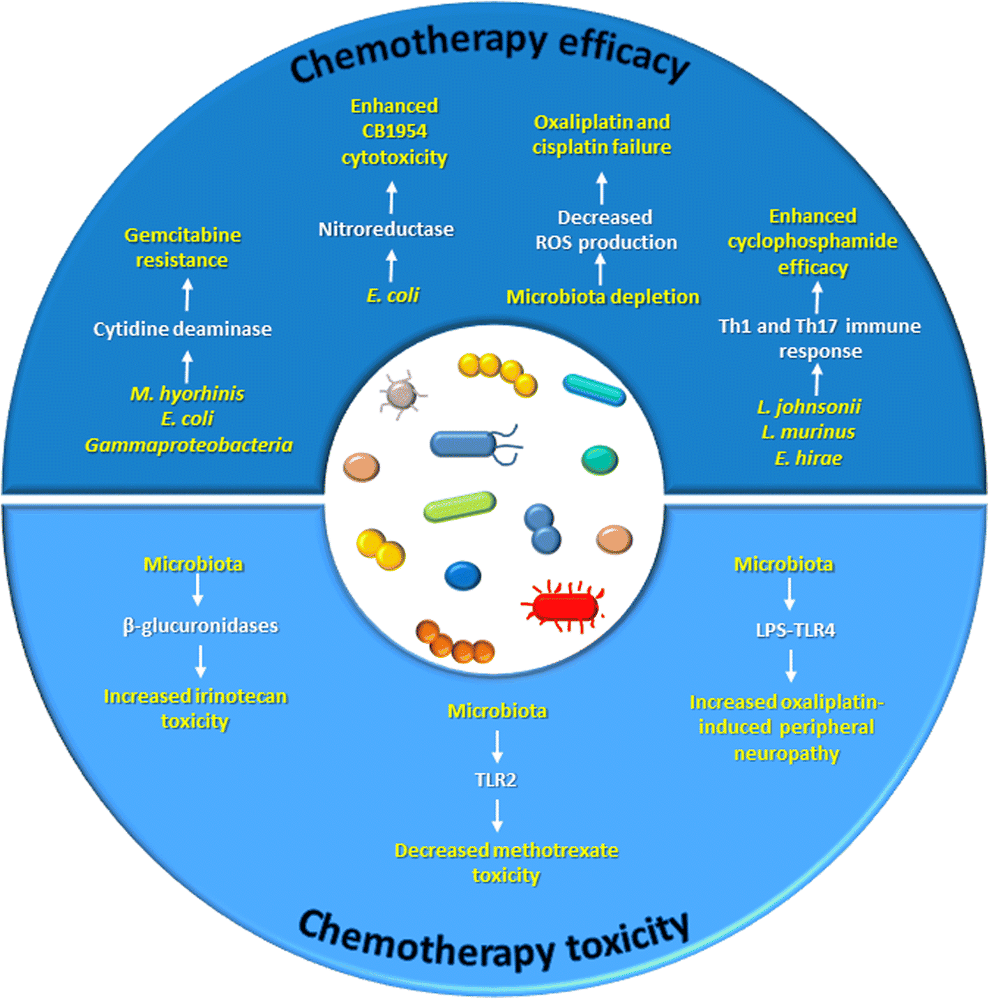 On the other end of the spectrum, Colorectal cancers enriched in Fusobacterium nucleatum have demonstrated worse prognosis. Because of the bacteria conveyed resistance to oxaliplatin and 5-fluorouracil by inducing autophagy. Oral administration of 5-Fu has been reported to alter the bacterial diversity and community composition of the gut. Several such instances have been reported involving both chemotherapeutic efficacy and chemotherapeutic cytotoxicity.
