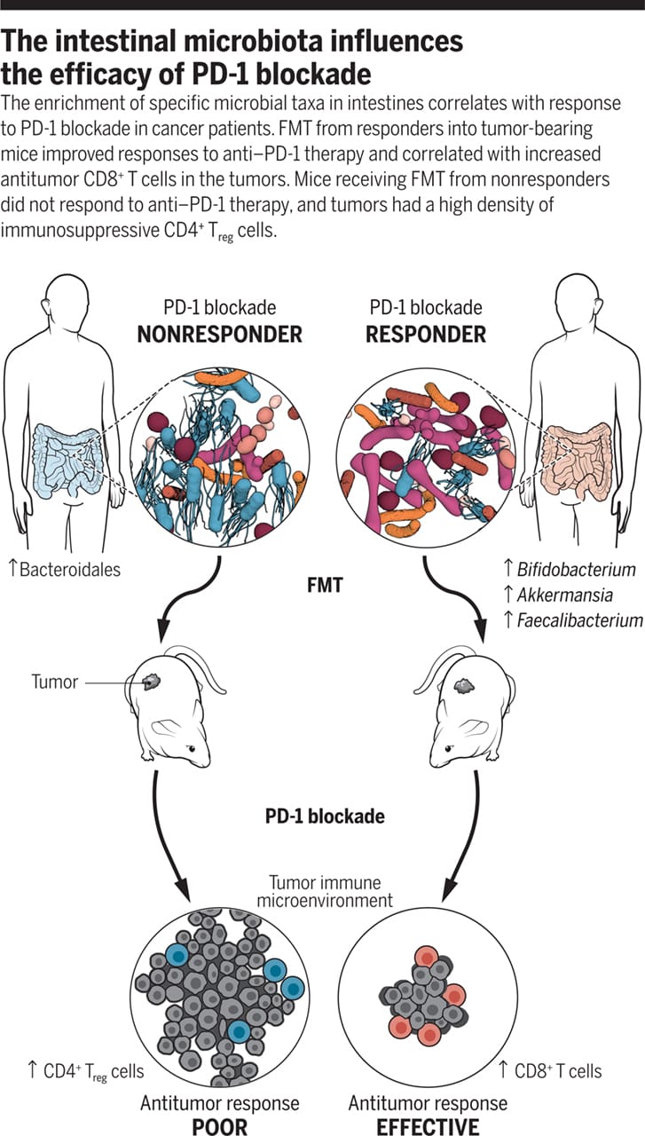 Given that gut microbiome has such a significant on cancer therapy, it has recently found traction in cancer chemotherapeutic assistance. The transfer of highly complex whole communities of microorganisms from responders has been shown to result in durable changes in the recipient. FMT from colorectal patients into germ-free mice can elicit dysplasia and polyp formation. FMT from cancer patients responding to PD-1 based immunotherapies into germ free mice have shown increased efficacy. Non-responders to immune therapies were characterized by low abundance of Akkermansia muciniphila. Response to tumour therapy was improved by oral supplementation of the same bacterium.
