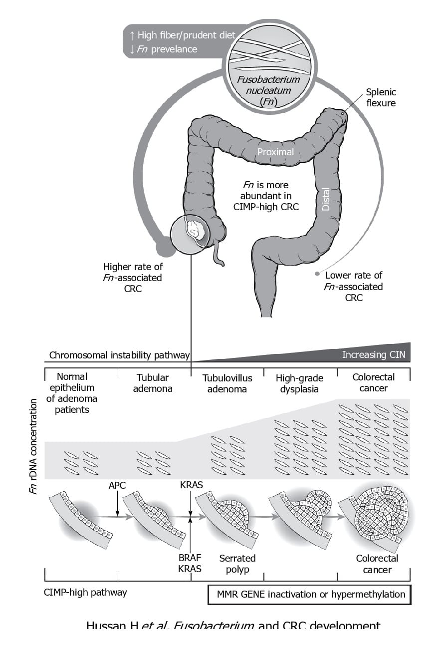 F. nucleatum represents the best studied bacterium with a clear association with CRC. F. nucleatum has been consistently found more abundant in faces from CRC patients, while its lower abundance has been associated with overall longer survival time. Even patients with simple adenomas exhibit an increased prevalence of F. nucleatum in colonic tissue, while its persistence in metastatic colorectal tumour has been recorded.