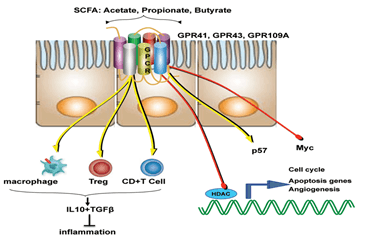 Diet and nutritional habits have been strongly linked to CRC. This diet related risk is influenced by the balance between production of health-promoting microbial metabolites (ex. butyrate) and potentially carcinogenic metabolites (ex. secondary bile acids). Butyrate, a chemoprotective agent, acts as a histone deacetylase (HDAC) inhibitor capable of decreasing proliferation and increasing apoptosis in CRC cells. Butyrate could also diminish tumorigenesis by attenuating inflammation and colonocyte permeability and maintaining barrier function of the epithelium.