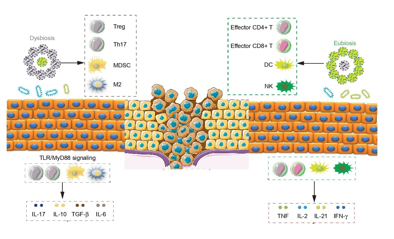 The link between microbiome and 'trigger, development & progress of cancer', and more recently even its treatment, has been well established. These established correlations indicate that the microbiome and cancer affect each other in a “bidirectional and cyclical manner”. On one end the cancer development changes microbiome composition while such changes also contribute to cancer progression in return, and this process continues in a cyclical manner. Furthermore, it’s also been established that the effect of microbiomes on cancers can both be detrimental (increase the pathogenesis of cancer and more) or beneficial (being protective against the triggers of cancer and more).