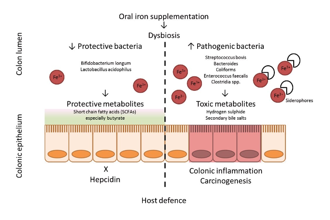 Numerous studies have shown that iron significantly influences the intestinal microbiota, its composition and abundance. Of these, Bifidobacteriaceae are capable of binding large amounts of iron in the large intestine., thereby limiting the formation of free radicals synthesized in the presence of iron. This is known to reduce the risk of colorectal cancer significantly.