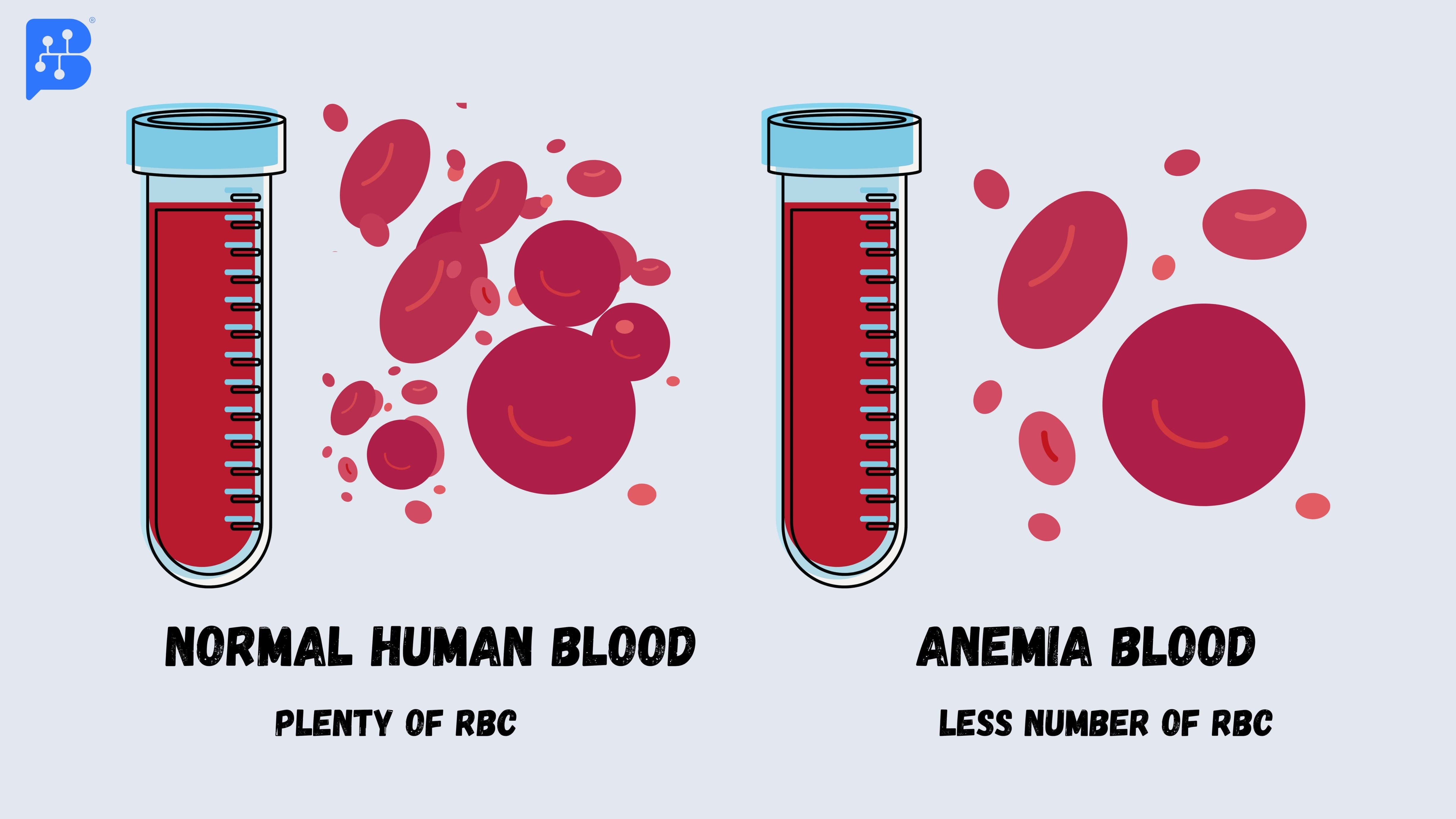 The graphic illustrates the difference in red blood cell (RBC) count between a healthy person and a person who has anemia. A healthy human has an abundance of red blood cells in their blood, while an anemic person has fewer red blood cells in their blood. The key feature of anemia is highlighted by this graphic, which highlights the blood's decreased ability to carry oxygen because of low RBC counts.