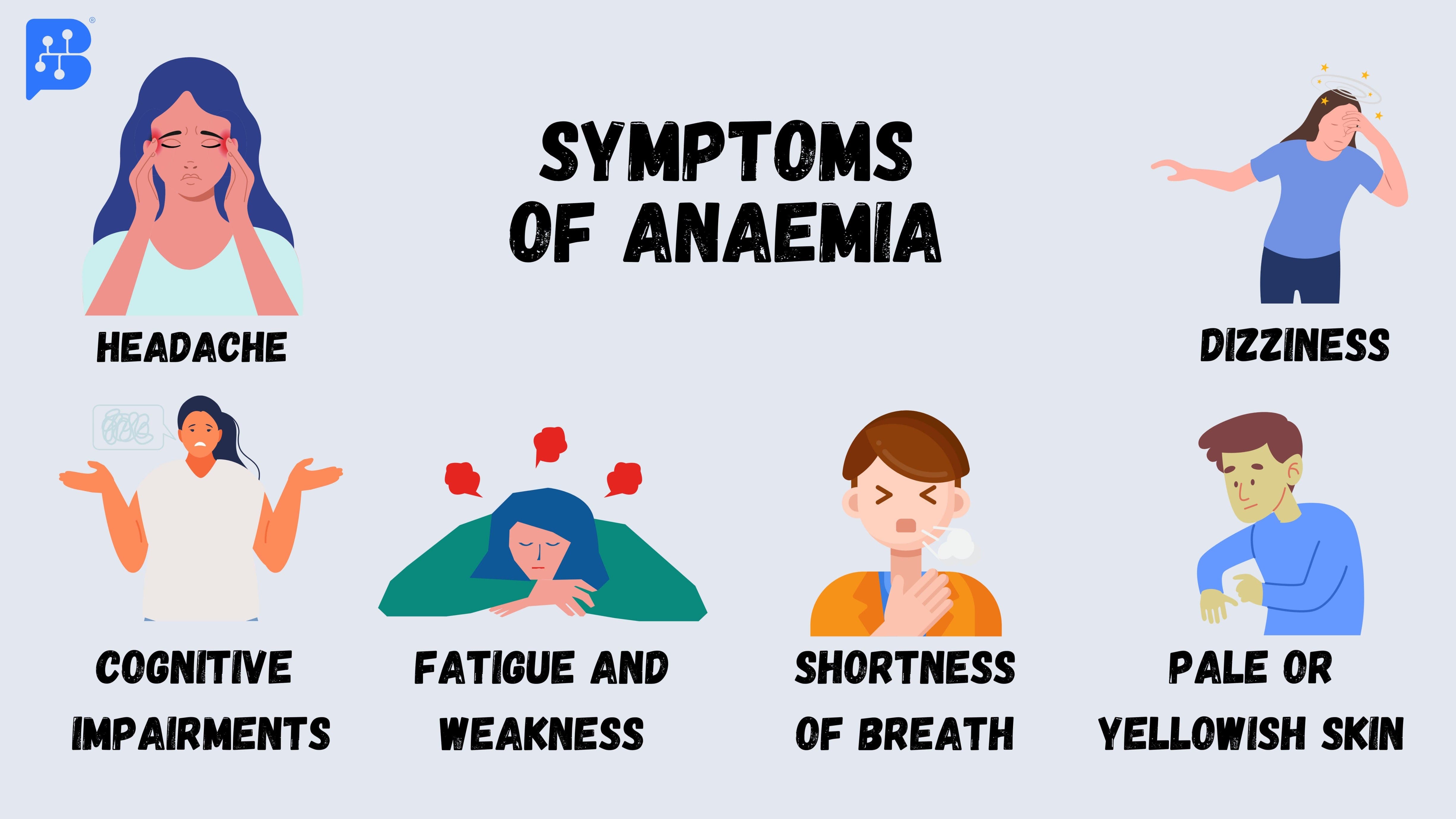 The pictures above show typical signs and symptoms of anemia. Continuous signs include headaches, cognitive decline, fatigue and weakness, shortness of breath, pale or yellowish skin, and dizziness, which can result from iron deficiency. These symptoms underline the serious impact of iron deficiency on both physical and cognitive function, highlighting the significance of early detection and management techniques to reduce its impacts on individual health.