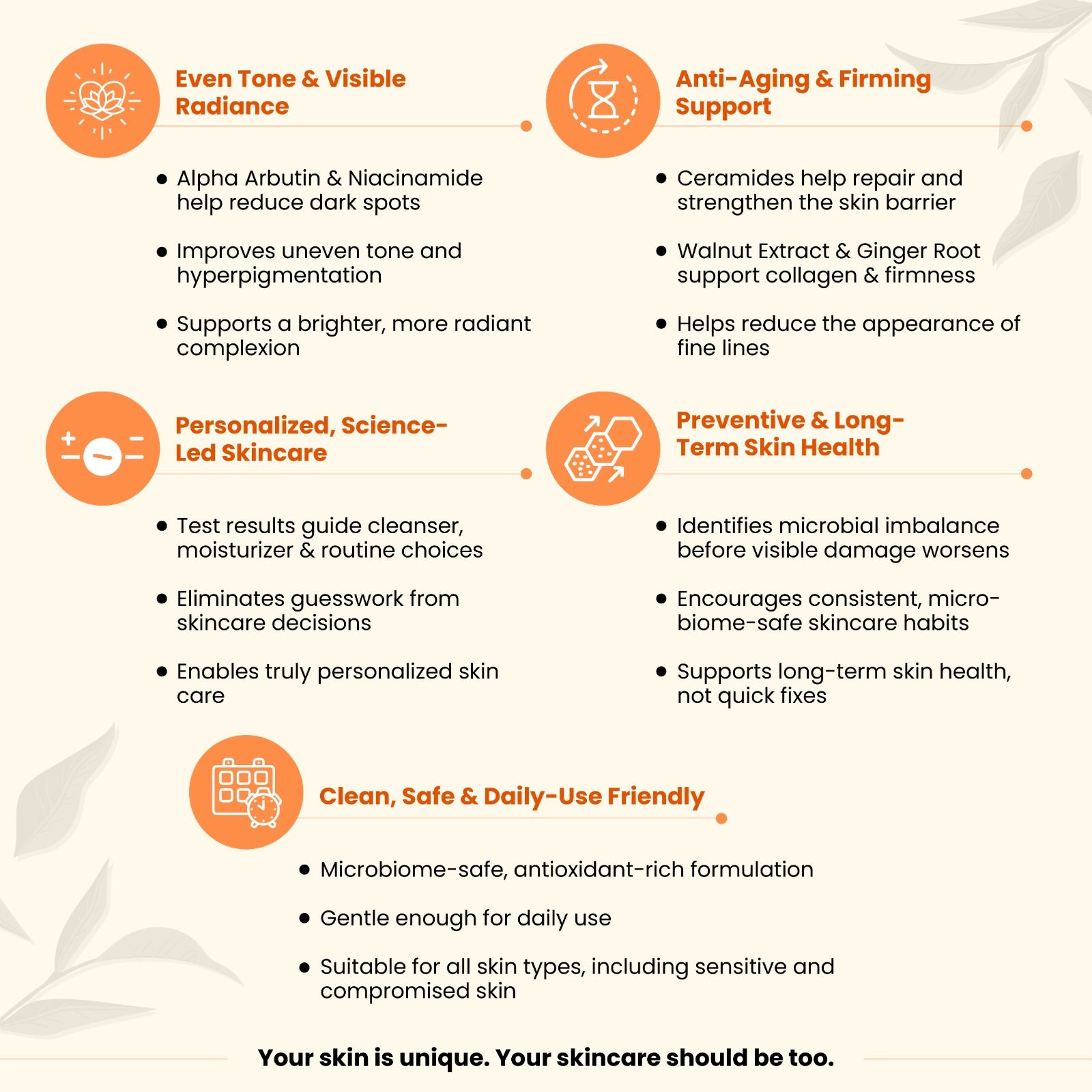 BugSpeaks® analyses your complete skin microbiome composition, characterizes its diversity and abundance, associates them with various skin health concerns, with the ultimate goal of generating a comprehensive set of personalized skincare recommendations and microbiome-balancing solutions.