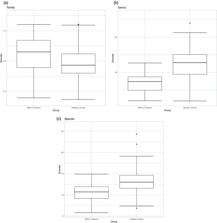 (a–c) Mean alpha diversity between NSCLC patients and healthy controls for (a) Family, (b) Genus, and (c) Species levels.