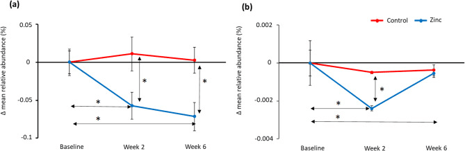 Changes in mean relative abundance (%) levels of glycolysis pathway genes for the control toothpaste (red) and zinc toothpaste (blue) compared to baseline, based on analysis using Tax4Fun (a) and meta transcriptomics (b). Significant differences (p < 0.05) are highlighted * and error bars represent standard error.