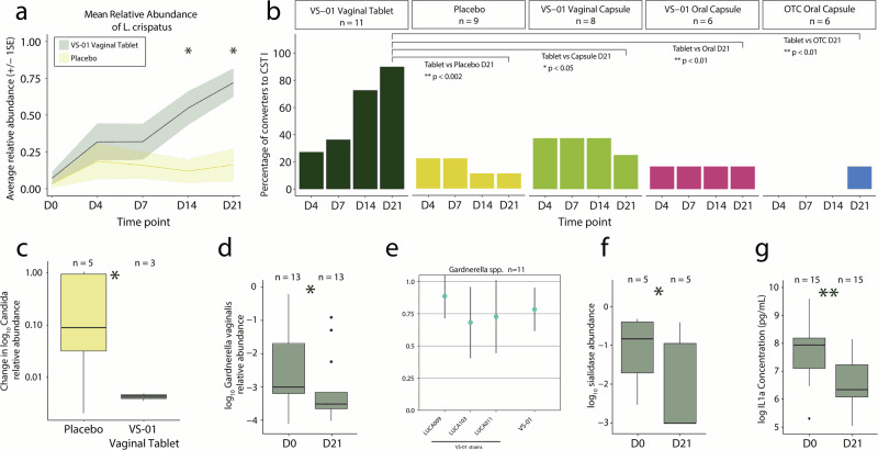a) Mean relative abundance of L. crispatus in the multi-strain synbiotic vaginal tablet (VS-01) and placebo arms (n = 19) among participants not in CST I at baseline (<50% relative abundance of L. crispatus, as defined in Methods). * indicates p < 0.05 difference between the multi-strain synbiotic and placebo; b) The proportion of participants who converted to CST I at each timepoint is shown for Part A and Part B among those with a baseline dysbiotic/non-optimal microbiome (n = 39), along with associated p values; c VS-01 significantly decreased the mean abundance of Candida spp. (C. albicans,C. tropicalis, and C. parapsilosis) compared to placebo from baseline to D21 (p < 0.05); d VS-01 significantly decreased the abundance of Gardnerella vaginalis, a key dysbiotic/non-optimal bacterium, from baseline to D21 (p < 0.05); e Each strain in VS-01 and the VS-01 consortium inhibited the growth of Gardnerella spp. in vitro. The fraction of inhibition is shown across all strains, with 1 representing complete inhibition and 0 representing no inhibition; f VS-01 significantly decreased sialidase genes from baseline to D21 among participants with baseline detectable sialidase genes (p < 0.05); g VS-01 significantly decreased the concentration of IL-1ɑ from baseline to D21 (p < 0.01).