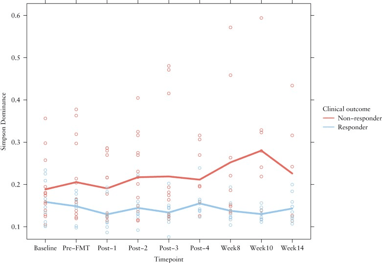 Change in Simpson dominance was calculated for non-responders and responders. The points indicate the individual measurements of the patients. The coloured lines are the mean Simpson dominance per group.