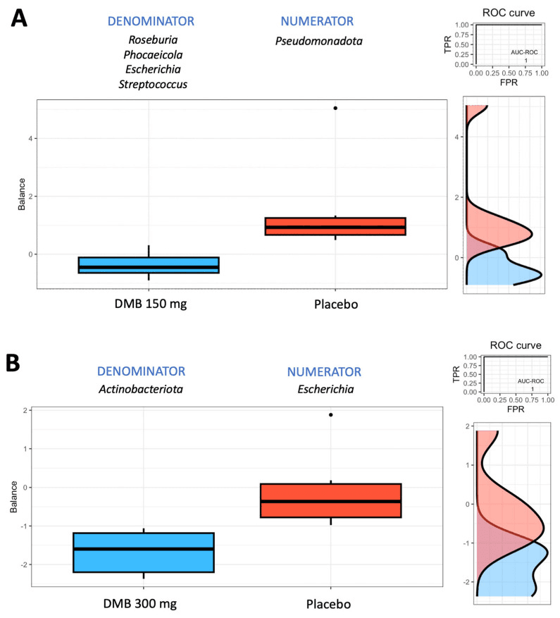 Group balances are presented in an overview. The top of the plot indicates that groups of taxa constitute the global balance. Box plots illustrating the distribution of balance scores for the DMB 150 mg (standard dose) and placebo groups (A) and the DMB 300 mg (high dose) and placebo groups (B). On the right, the ROC curve with its AUC value and the density curve are displayed.