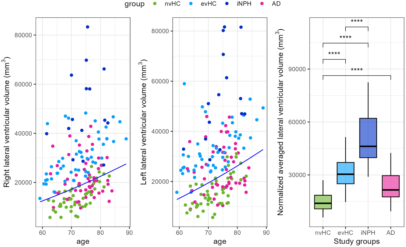 Brain ventricular volumes by study group. The left and right lateral ventricular volume of evHC group participants lies above the 80th percentile of the ADNI cohort’s normal distribution, represented by a dark blue line (A,B). The study groups differ significantly in brain ventricular volume (C). Statistics: Wilcoxon rank-sum test with **** p < 0.0001.