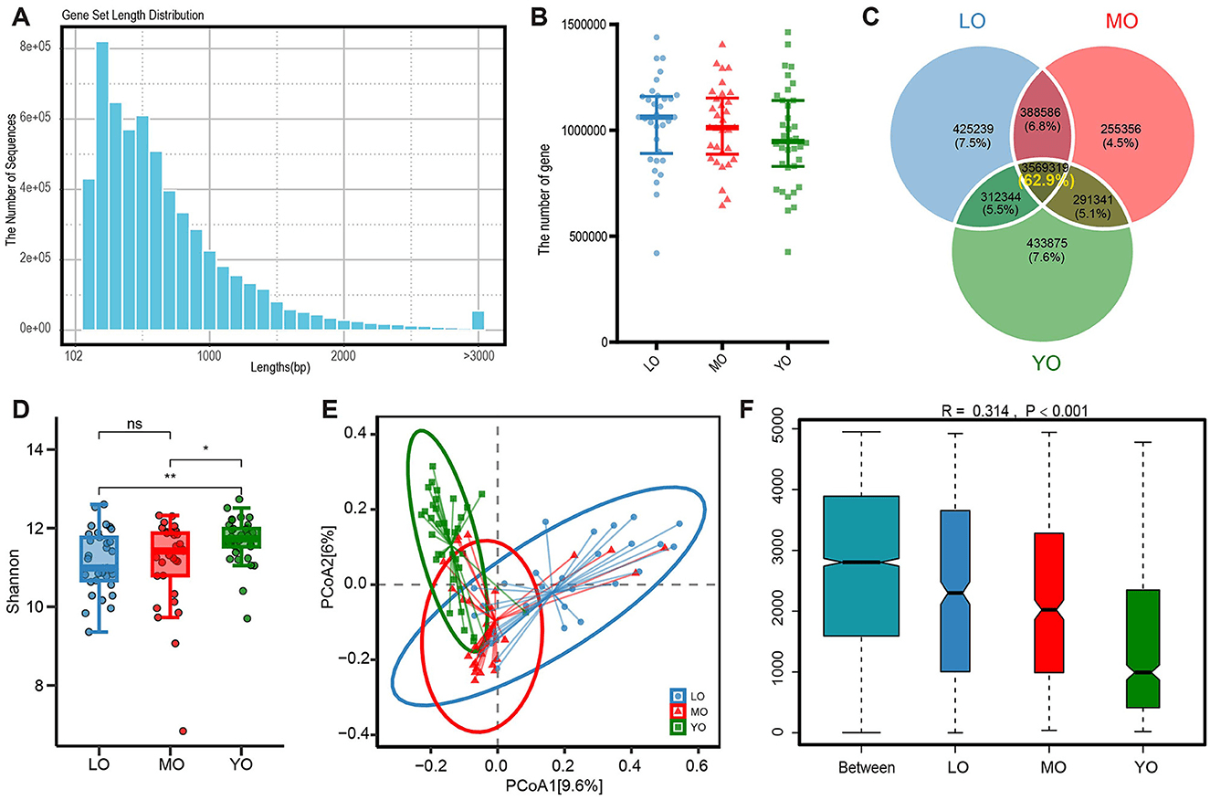 Outcomes of gene annotation analysis derived from metagenomic sequencing of the gut microbiome. (A)The histogram illustrates the distribution of lengths within the non-redundant gene set. (B) The scatter plot illustrates the differences in the quantity of non-redundant genes among the three groups. (C) The Venn diagram depicts the quantity and proportion of both shared and unique genes across the three sample groups. (D) The comparison of alpha diversity was conducted using the Shannon index. Each data point corresponds to a sample, while the box plot illustrates the median, quartiles, and outliers. ns, p-value > 0.05; *, p-value ≤ 0.05; **, p-value ≤ 0.01. (E) The analysis of β diversity was conducted using the Bray-Curtis distance metric. The principal coordinate analysis (PCoA) plot illustrates the distribution of gene composition across the three sample groups. (F) The ANOSIM (Analysis of Similarity) analysis of gut microbiota was conducted using the Bray-Curtis distance metric. The x-axis displays all samples categorized by group, while the y-axis illustrates the rank of the Bray-Curtis distance. The R is between (−1,1): if R > 0, the inter-group difference is significant; if R <0, the intra-group difference is greater than the inter-group difference. The reliability of the statistical analysis is represented by the p-value, with p-value <0.05 denoting statistical significance.