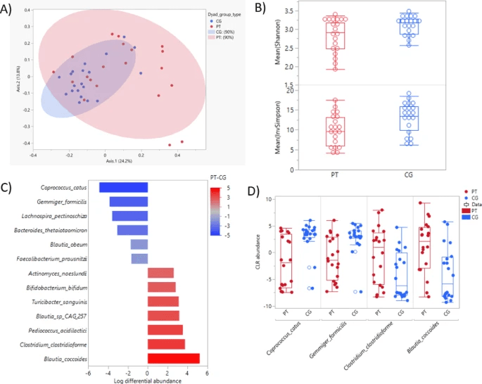 Gut microbiome features of caregivers and patients. (A) Principal Coordinate Analysis based on Bray–Curtis dissimilarity of gut compositional differences (R-squared: 0.070, p = .005). (B) Box-and-whisker plot of alpha diversity measured by Shannon Diversity Index (p = .058) and Inverse Simpson Diversity Index (p = .030) between patients and caregivers. (C) Differentially abundant taxa between patients and caregivers by log differential abundance (x-axis) (p < .05 and 20% FDR). Heat map gradient indicates log fold change difference. (D) Box plot of the two most abundant species and the two least abundant species in patients. Red: patients (PT); Blue: caregivers (CG).