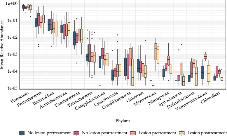 Mean relative abundance of phyla. The data is grouped by the lesion status and the sampling time. Phyla are ordered in decreasing order based on total read count.