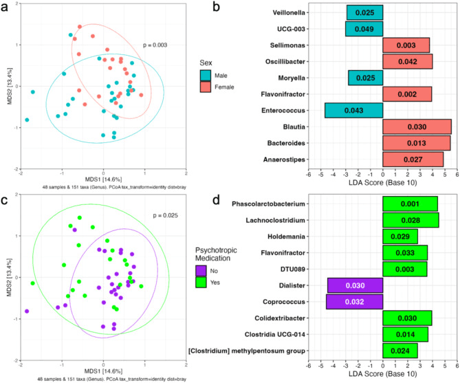 Associations between baseline gut microbiome and clinical characteristics of the participants in the study. (a) Baseline microbiome composition varies based on sex with male and female participants clustering separately in the PCoA plot determined from Bray-Curtis dissimilarity (p = 0.003, R2 = 0.051 by PERMANOVA). (b) Ten genera are overrepresented in male or female participant microbiomes. (c) Baseline microbiome composition also varies based on psychotropic medication usage controlling for sex (PERMANOVA, p = 0.025, R2 = 0.034). (d) Ten genera are overrepresented in psychotropic medication users and non-users.