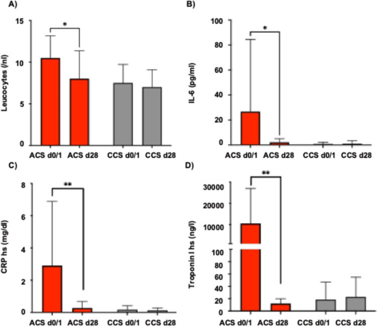Inflammatory panel (A-C) including A leucocytes, B interleukin-6 and C high-sensitive CRP and D hs-Troponin I levels in patients with acute coronary syndrome (ACS) compared to patients with chronic coronary syndrome (CCS) at baseline and follow-up at 28 days. Statistical significance was calculated using the student’s t-test (* denotes p < 0,05, ** denotes p < 0.01)