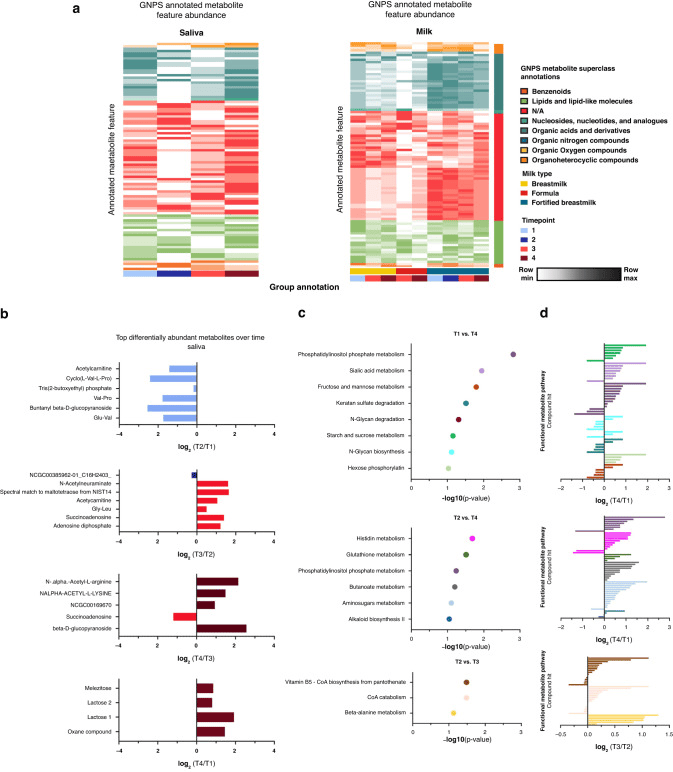 a) Heatmap of GNPS annotated metabolite features in saliva and milk samples colored by metabolite (row) min to max milk-type across time points. Metabolite average intensity by time point was used for visualization. Column grouping was done by time point and milk type in saliva and milk samples respectively. b) Bar plots showing differently abundant GNPS annotated metabolites in saliva samples based on timepoint binary comparisons. Significantly altered metabolites are colored by time points in which they are found to be higher in each respective binary comparison. c) MetaboAnalyst functional pathway analysis across time points for saliva samples. Samples were sorted by p value of the respective binary comparisons for pathway analysis. d) MetaboAnalyst functional pathway compound hits with their respective log2-fold change per comparison. Bars are colored by pathway hits.
