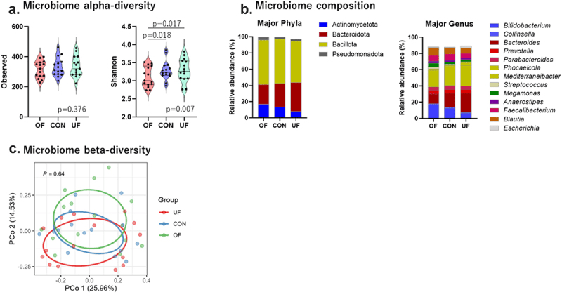 Changes in the diversity and composition of the intestinal microbiota due to dietary intervention. Major phyla and genera of the microbiome composition indicate the dominant bacteria with an average bacterial composition ≥1.0% of the relative abundance.
