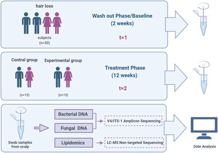 Overview of the study design. Swab samples were collected from scalps at baseline (t = 1) and treatment (t = 2) phases. Bacterial and fungal DNA was extracted from the collected swab samples, and amplicon (bacterial 16S rDNA V4 and fungal ITS1 region) and lipidomic analyses were used to carry out taxonomic and functional analyses.