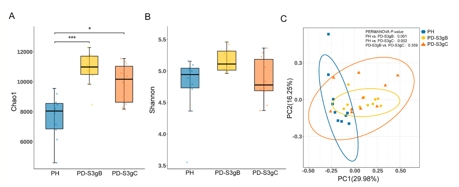 FIGURE 1 | Microbial diversity of the subgingival community at the species level in three periodontal conditions. A. and B. Chao1 index (A) and Shannon index (B) of the alpha diversity. Data were analyzed using the Kruskal–Wallis H test and Dunn's multiple comparisons test with BH adjustment (*p < 0.05, **p < 0.01, ***p < 0.001). (C) Principal coordinates analysis (PCoA) plot (based on Bray- Curtis distance) and PERMANOVA result of the microbiome structure. PD- S3gB, Stage III Grade B periodontitis; and PD- S3gC, Stage III Grade C periodontitis; PH, periodontal health.