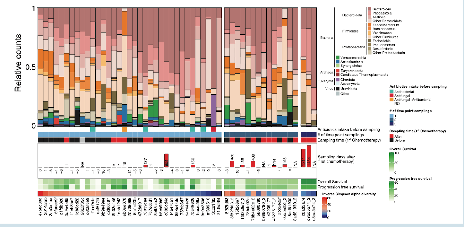 Figure 2. position of fecal samples (n only 1 sampling point (n Distribution of microbiome composition in primary central nervous system lymphoma patients. Barplot showing the phylogenetic com = 52). Samples are ordered by decreasing inverse Simpson alpha diversity values and by a group of patients having = 35, left), 2 sampling points (n = 7), or 3 sampling points (n= 1).