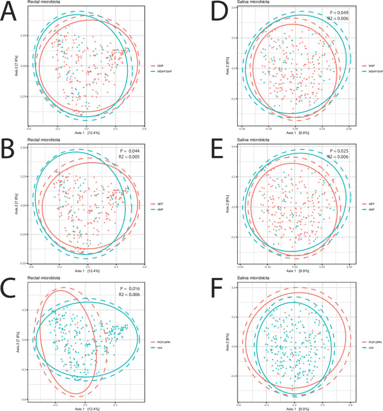 Figure 2. Beta diversity of bacterial communities. Principal coordinate analysis (PCoA) plot displaying Bray-Curtis distances of rectal (A–C) and saliva (D–F) microbiomes in groups of (A, D) MSAP and SAP versus MAP, (B, E) acute necrotising pancreatitis (ANP) versus acute oedematous pancreatitis (AOP), and (C, F) persistent organ failure (POF) and/or drained infected pancreatic necrosis (dIPN). Significance testing with PERMANOVA. MAP, mild acute pancreatitis; MSAP, moderate severe acute pancreatitis; SAP, severe acute pancreatitis.