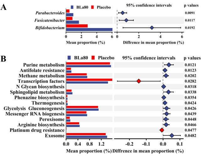 Effect of BLa80 intervention on gut microbiota structure and function. (A) Analysis of differences in the genus levels. (B) Analysis of PICRUSt metabolic pathways. The STAMP analysis was used to identify significantly differentially enriched genera and metabolic pathways.