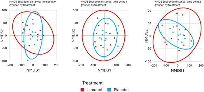 NMDS ordination of gut microbiota composition. Each plot shows samples from L. reuteri + PPI (blue) and Placebo + PPI (red) at a given time point (T0, T1, T2). No distinct clustering by treatment is observed at any time point, indicating a high degree of overlap between groups.