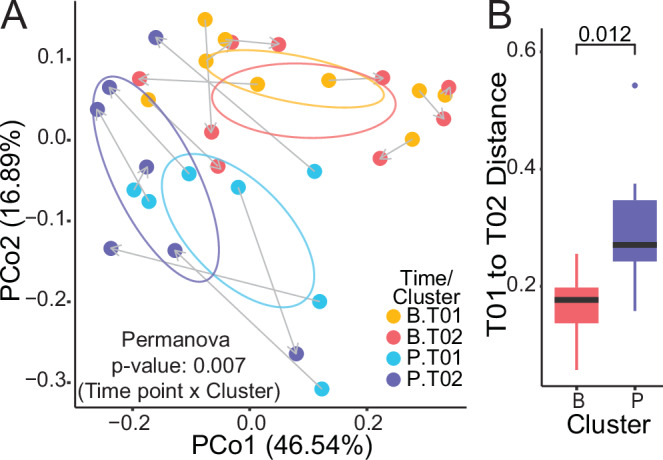 A Principal coordinate analysis of weighted Unifrac distances for subject samples before and after UBF treatment (Permanova analysis), and B intra-individual weighted Unifrac distances between T01 and T02 for each UBF cluster (Mann–Whitney analysis).