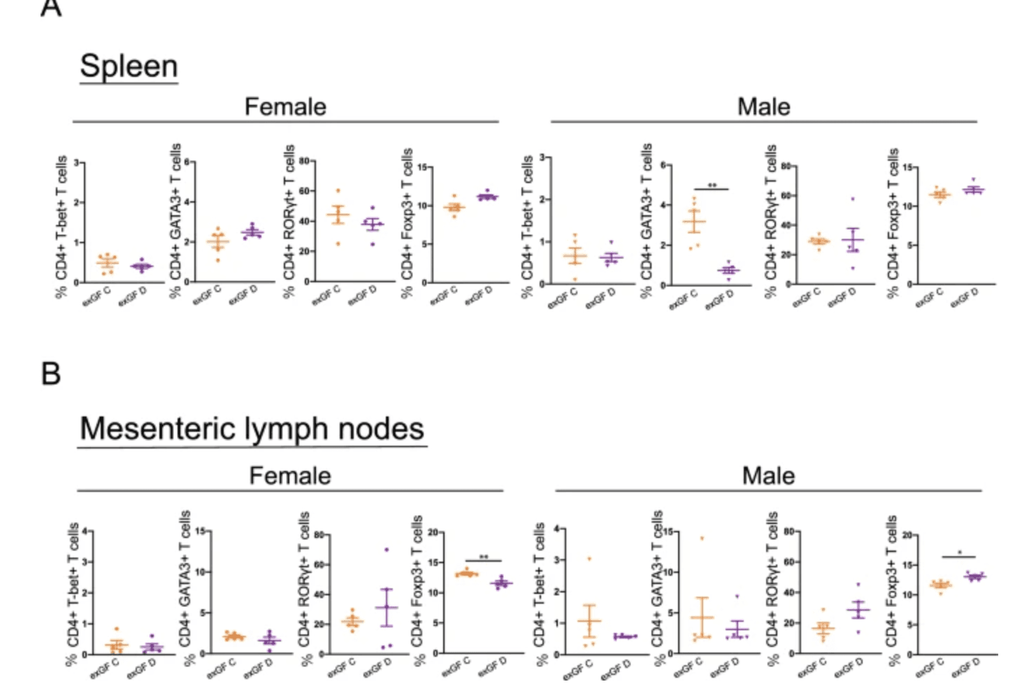 Subpopulations of CD4+ T cells in young ex-germ-free recipients of age-unmatched fecal microbiota transfer. Flow cytometric analyses of CD4+ T cells expressing T-bet+, GATA3+, RORγt+, or Foxp3+ were performed in the spleen (A) and mesenteric lymph nodes (B) of ex-germ-free (exGF) C (fecal microbiota transfer [FMT] from young donors) and exGF D (FMT from adult donors) groups. Data are described as the mean ± SEM (black filled circle: female [n = 5], black filled inverted triangle: male [n = 5]). *p < 0.05, **p < 0.01. The gating strategy for flow cytometric analyses is shown in figure. |