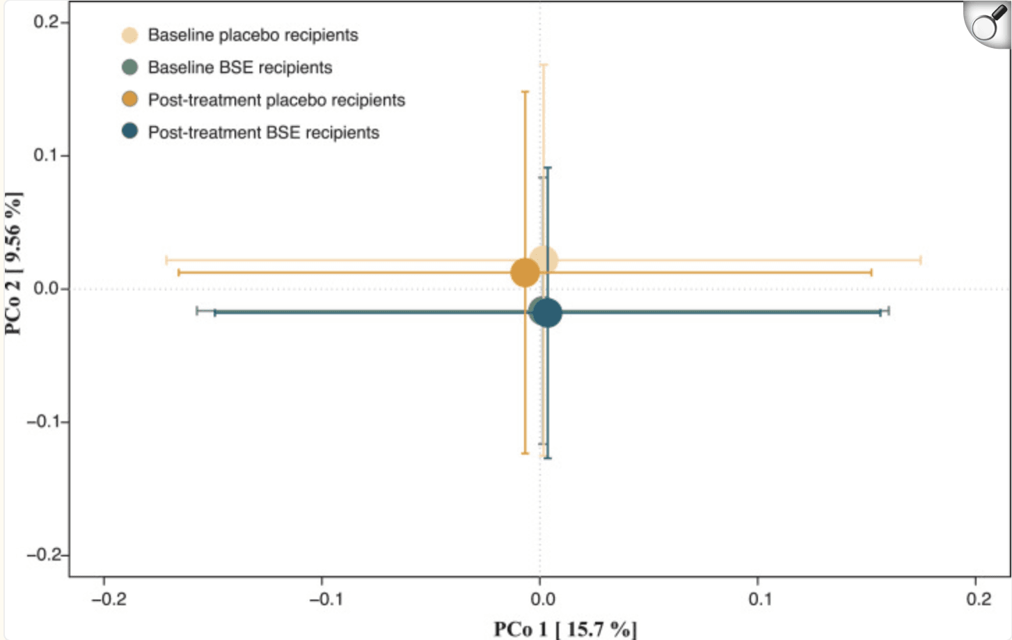 Principal coordinates analysis of species-level Bray-Curtis dissimilarities at baseline and post-treatment between study participants randomized to BSE and placebo, respectively. No significant differences were observed. |