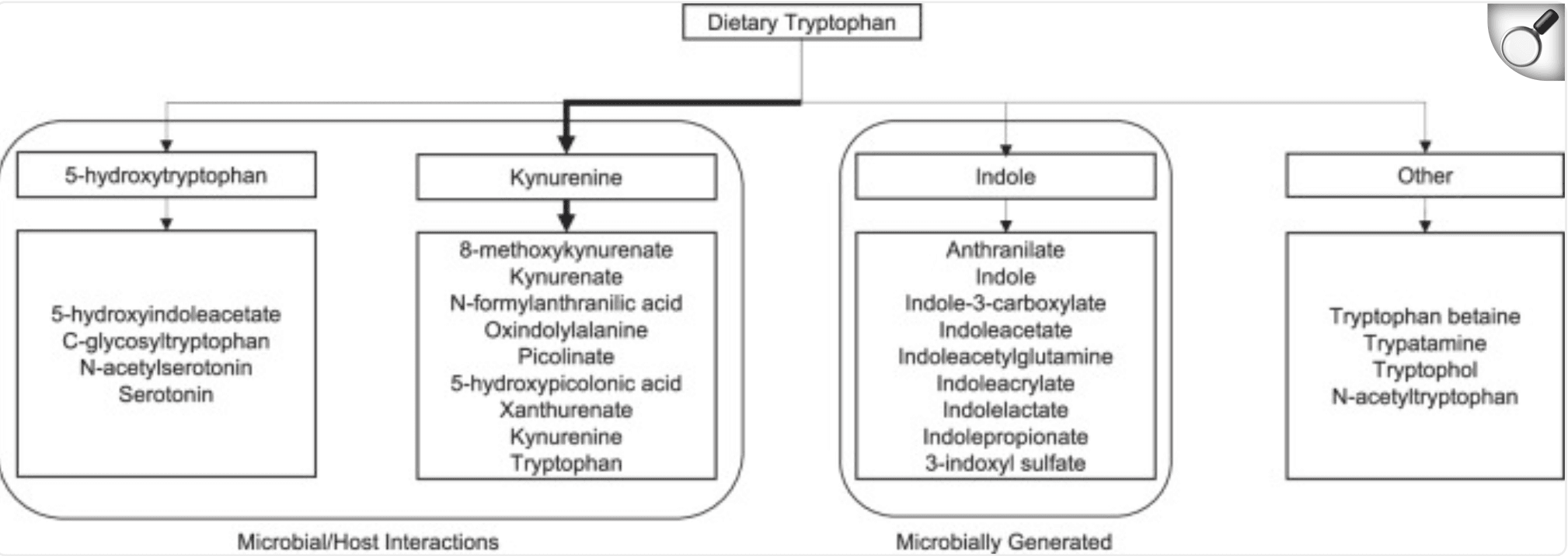Metabolites within the tryptophan pathway. Arrow thickness represents the strength of the pathway under normal conditions. |