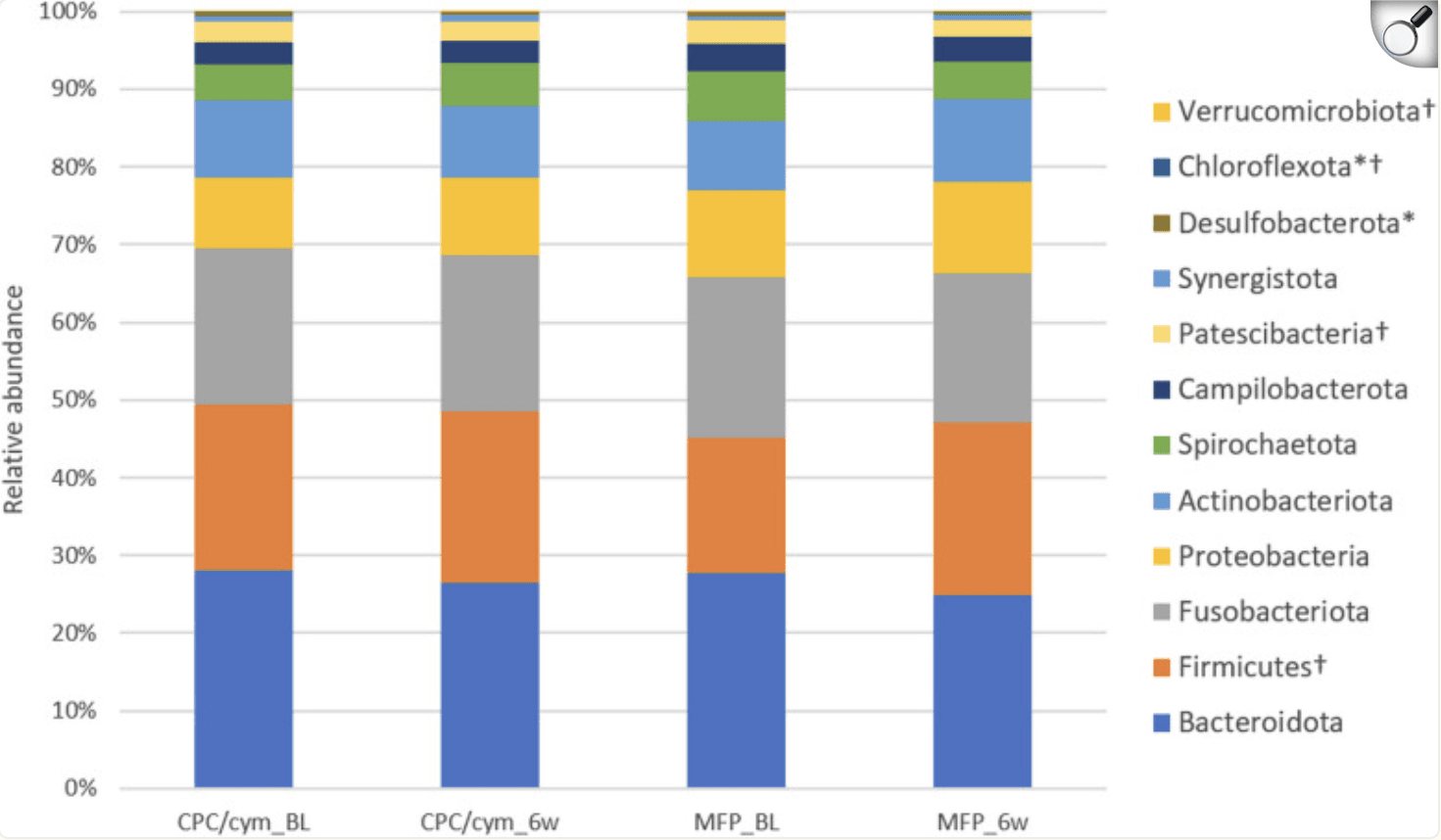Changes in the relative abundance of the phyla with an abundance > 0.05%. Treatment groups: CPC/cym, toothpaste with cetylpyridinium chloride (CPC) and cymenol (cym), as main active ingredients; MFP, toothpaste with sodium monofluorophosphate (MFP). BL: baseline; 6w: 6 weeks. *: significant intragroup differences in CPC/cym; †: significant intragroup differences in MFP.