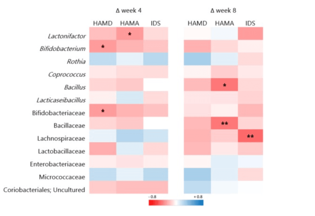 Correlations between microbial changes and changes in clinical outcomes. * significant according to uncorrected p values (p < 0.05); ** significant according to FDR corrected p values (p < 0.05). The strength of the correlation (Spearman's rho) is indicated by the colour gradient, with red for negative and blue for positive correlations; week 4: n = 42 (n = 21 probiotic, n = 21 placebo); week 8: n = 36 (n = 19 probiotic, n = 17 placebo). (For interpretation of the references to colour in this figure legend, the reader is referred to the web version of this article.)