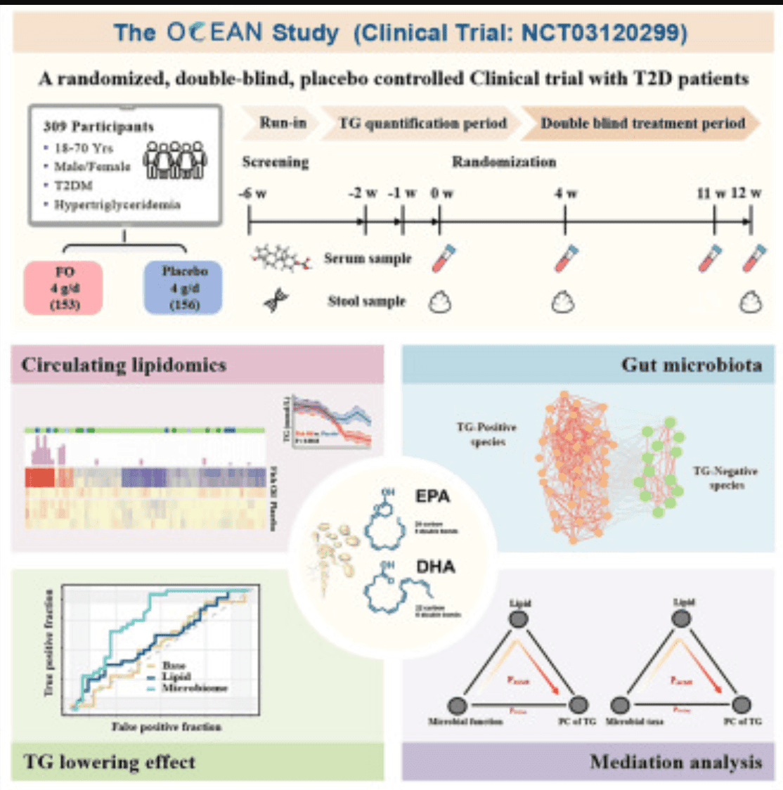 The study titled "Impact of omega-3 fatty acids on hypertriglyceridemia, lipidomics, and gut microbiome in patients with type 2 diabetes" investigates the effects of omega-3 fatty acid supplementation on triglyceride levels, lipid profiles, and gut microbiota composition in individuals with type 2 diabetes. Conducted as a randomized controlled trial, the research aims to elucidate the potential benefits of omega-3 fatty acids in managing hypertriglyceridemia—a common lipid disorder in type 2 diabetes patients.