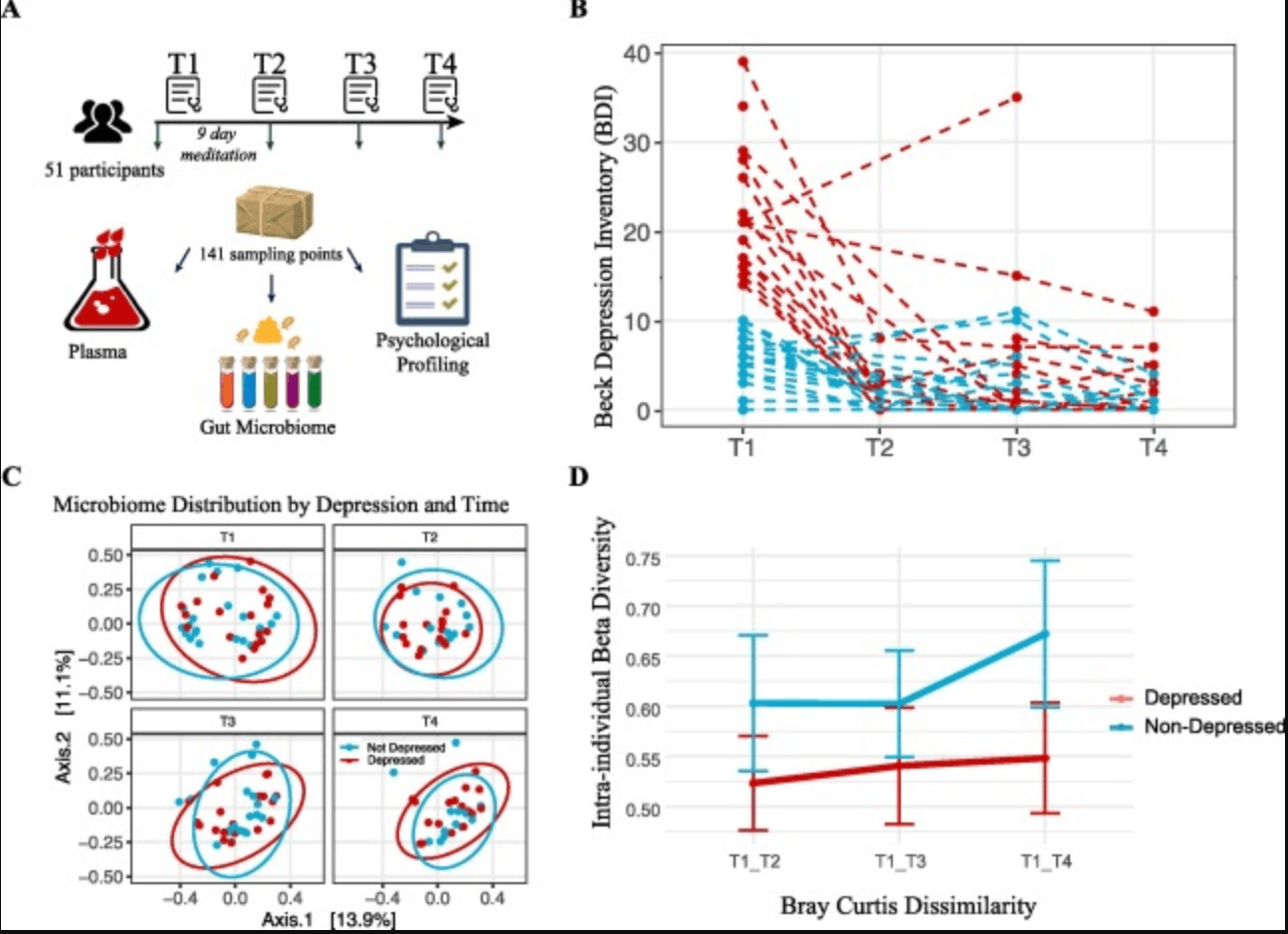 Researchers collected a total of 142 multi-omics samples from participants at three time points: before the intervention, during the program, and three months afterward. These samples were analysed to assess changes in the gut microbiome composition and cytokine levels, which are indicators of immune system activity. The study aimed to explore the complex associations between psychosocial interventions, gut microbiome dynamics, and immune responses.