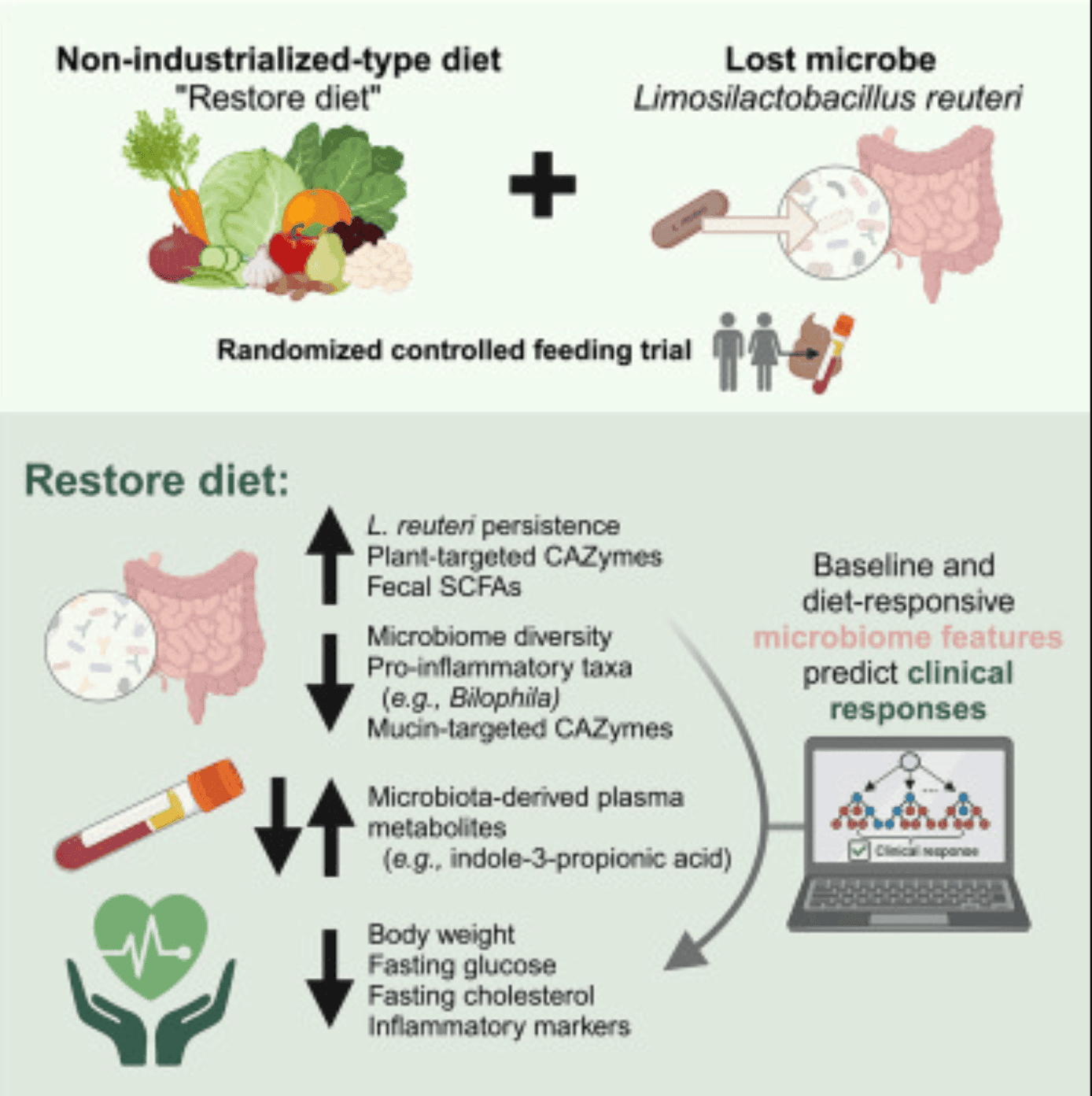 This study examines how adopting a non-industrialized, high-fibre, low-fat diet affects cardiometabolic and microbiome-related health in humans. Conducted as a randomized controlled trial, participants were divided into two groups: one consumed a traditional, fibre-rich diet similar to that of non-industrialized populations, while the control group continued with a typical industrialized Western diet. The primary aim was to determine how diet-driven changes in the gut microbiome could influence metabolic and cardiovascular health outcomes.