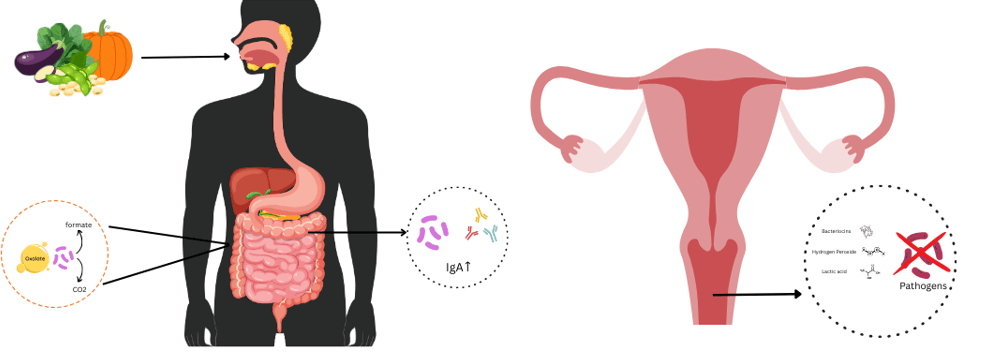 Figure represents the mechanisms of L. gasseri in oxalate degradation, enhancement of mucosal immunity, and inhibition of vaginal pathogens.