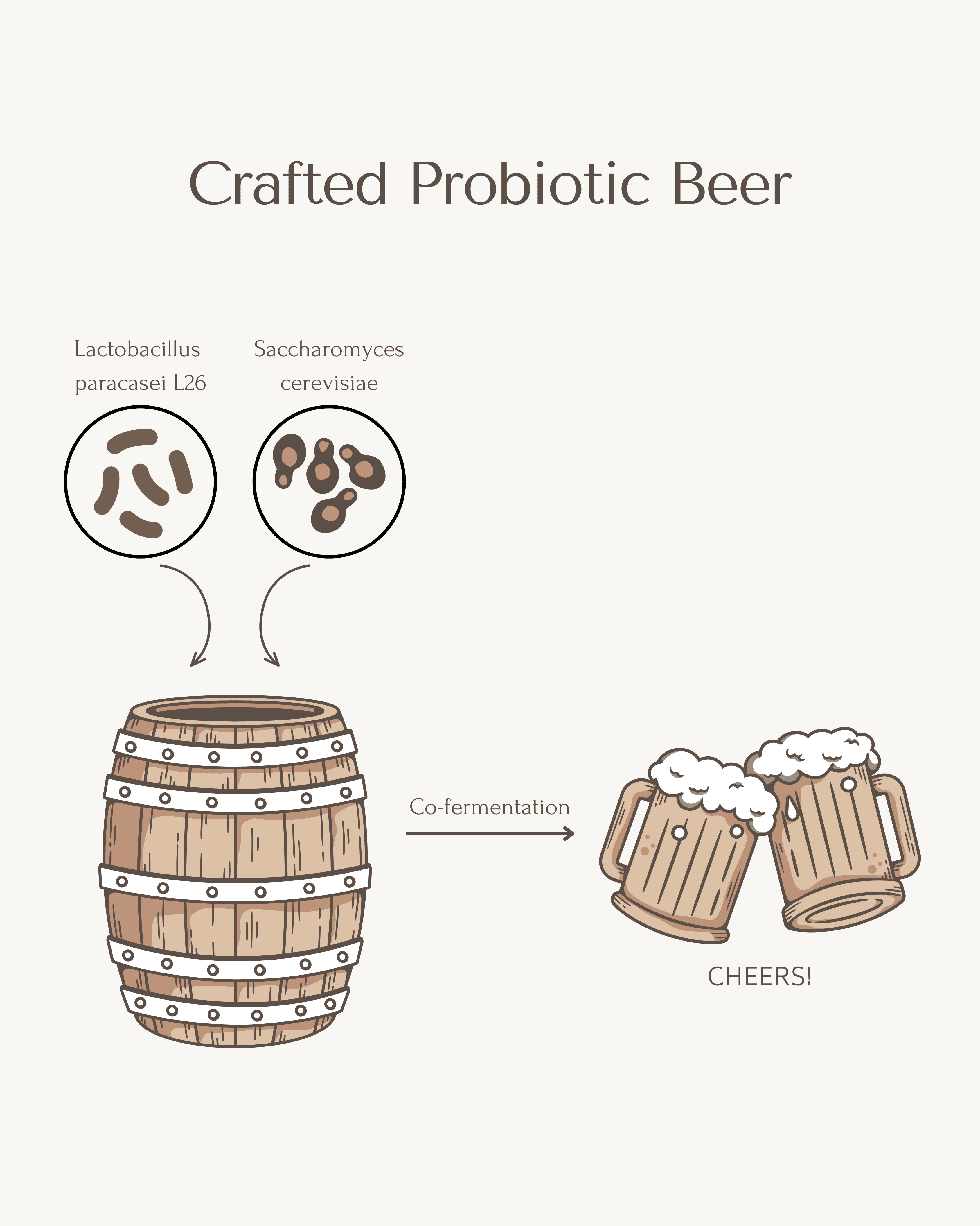The major drawback of using Lactobacilli as a starter culture in beer brewing is that they are usually killed by the acids and alcohol produced during fermentation. However, Mei Zhi Alcine Chan et al. took a creative deviation from the conventional brewing process by co-fermenting Saccharomyces cerevisiae (brewer’s yeast) and Lacticaseibacillus paracasei for the first time, they were able to produce beer with high numbers of viable probiotics! The Lactobacilli add a tart, sour flavor to the beer while also offering potential health benefits.