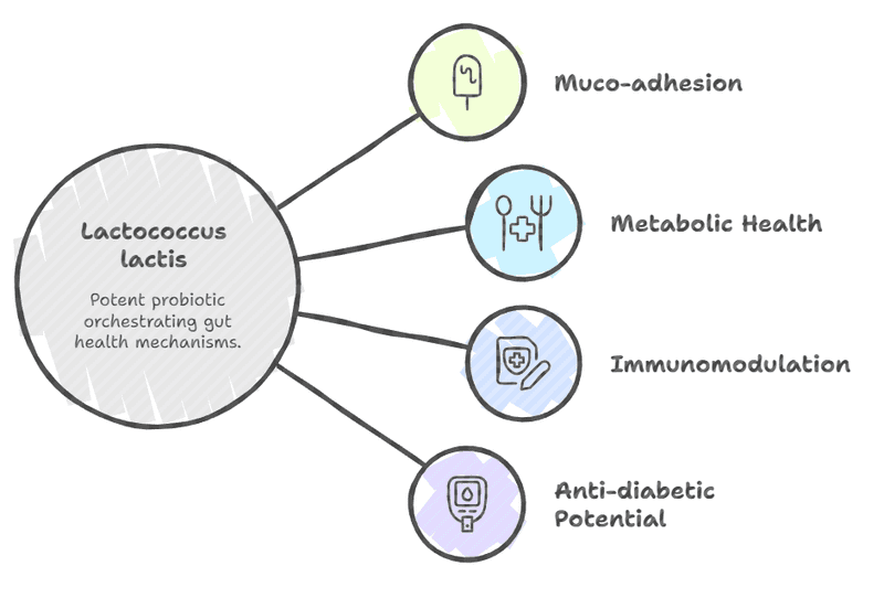 Lactococcus lactis acts as a potent probiotic by orchestrating a sequence of highly specific and synergistic mechanisms that bolster gut health, commencing with muco-adhesion, the critical first step involving the temporary colonization of the intestinal epithelium; this is achieved through cell-wall anchored proteins, such as the aggregation factor, which increases cell surface hydrophobicity to facilitate non-specific interactions with the mucus layer, ensuring the localized delivery of beneficial metabolites. A striking example of the organism's genomic economy is the cell-wall proteinase (PrtP), an enzyme vital for casein degradation in industrial settings, which simultaneously modifies the cell's physico-chemical properties, resulting in greater hydrophobicity and demonstrably increasing adherence to biotic surfaces like mucin. Once established, L. lactis, like other Lactic Acid Bacteria (LAB), contributes significantly to the gut's metabolic health by promoting the bioproduction of Short-Chain Fatty Acids (SCFAs)—key metabolites (e.g., butyrate) that nourish colonocytes, maintain intestinal barrier function, and provide valuable antioxidant activity while lowering the genotoxicity of fecal water. Furthermore, specific strains, such as L. lactis subsp. lactis, display sophisticated immunomodulation capabilities, showing promise in stimulating proinflammatory cytokine production and modulating overall immune and inflammatory signaling pathways, suggesting potential as a novel therapeutic agent for immune-related disorders; however, this promise is tempered by the vital caveat of high strain-specificity, requiring rigorous clinical validation for each proposed application, as highlighted by instances where one formulation (L. lactis spp. cremoris) failed to show significant effects on T-regulatory cells in healthy human subjects, underscoring the necessity of strain-level testing. A 6-week study on mice revealed the powerful anti-diabetic potential of a 14-strain probiotic isolated from fermented camel milk. This diverse microbial mix, featuring key gut-health champions like Lactococcus lactis, significantly improved both blood glucose and blood lipid parameters. This finding suggests that these traditional camel milk microbes could serve as a promising natural intervention to delay the development and progression of Type 2 Diabetes (T2D).