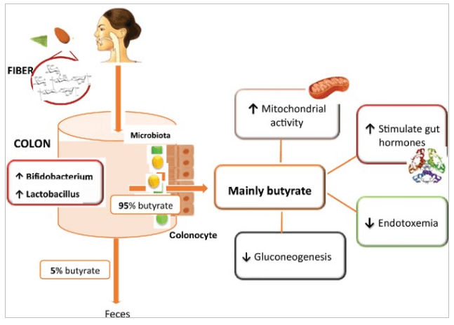 Either way, the end products of such fermentation are largely short chain fatty acids, including acetate, propionate and butyrate. These may further be metabolized systemically or locally to generate energy for us. However, they also play several other key roles that can promote heath, as depicted in the figure below.