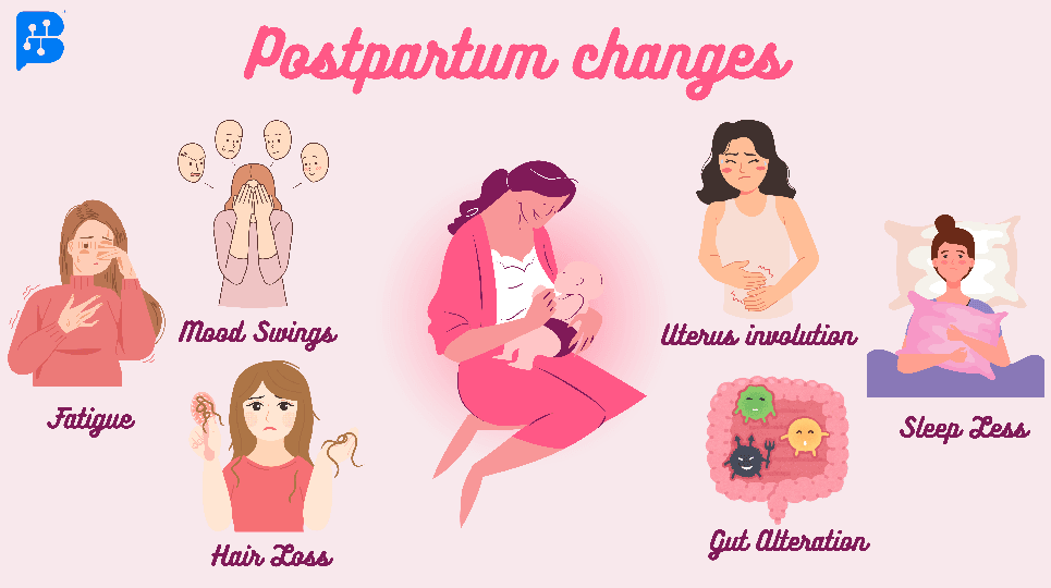 After giving birth, the woman experiences several physical and emotional changes. Constant mood fluctuations, exhaustion, lack of sleep at night, and hair loss. Numerous problems, including cramping, accompany uterine involution and gut alteration.
