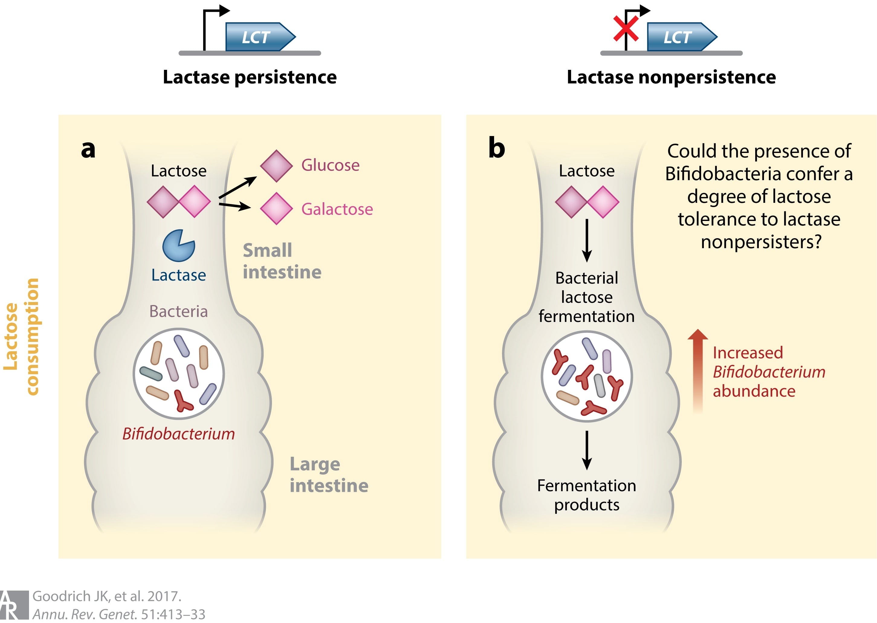 Figure 2: Interaction between the human lactase nonpersister genotype, Bifidobacterium abundance, and lactose in the host’s diet. Genetic variants near the LCT gene are associated with lactase persistence and in several microbiome GWASs were recently associated with Bifidobacterium relative abundance in fecal samples. The association may function according to the following scenario: (a) If an individual is a lactase persister and consumes lactose, the lactose is typically broken down into glucose and galactose in the small intestine by host lactase. (b) However, if the individual is a lactase nonpersister and consumes lactose, it travels to the large intestine, where it is fermented by lactose-utilizing bacteria, which includes Bifidobacterium. If Bifidobacteria are present, then the presence of lactose promotes their abundance. In individuals who do not consume lactose, Bifidobacterium abundance remains unaffected by their lactase persistence status (not shown). (Adopted from Goodrich et al. 2016; https://doi.org/10.1016/j.cell.2014.06.037).