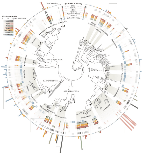 Below is a complex graph showing the different species of microbes found in different parts our body.