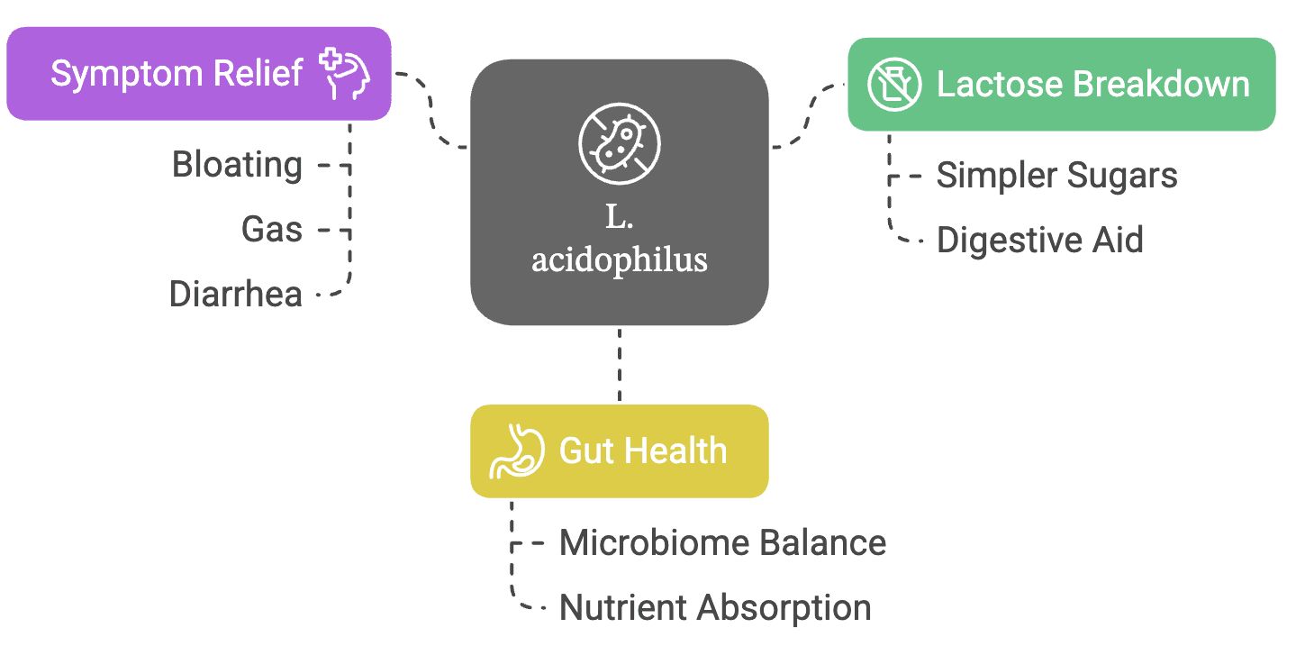 Lactobacillus acidophilus exhibits several key characteristics which play an important role in maintaining overall health. Lactobacillus acidophilus guards the gut by producing acids making the gut environment unfavourable for the growth of harmful bacteria and supporting the beneficial ones. It also plays a crucial role in strengthening the gut barrier integrity by increasing the expression of tight junction proteins and production of protective substances like mucin. Lactobacillus acidophilus produces lactase (β-galactosidase), which helps break down lactose into simpler sugars, easing symptoms like bloating and cramps in lactose-intolerant people. It also supports heart health by reducing cholesterol absorption in the gut and helping remove cholesterol from arteries, lowering the risk of plaque build-up. For immunity, it boosts protective antibodies (like IgG and IgA), increases helpful immune cells (CD4⁺), and reduces inflammation by lowering inflammatory markers like IL-6 and TNF-α. In oral health, it competes with harmful bacteria, reducing plaque and the risk of cavities. In pregnant women with gestational diabetes, taking Lactobacillus acidophilus through probiotic yogurt lowered blood sugar and HbA1c levels, likely by producing beneficial acids that improve insulin sensitivity and reduce inflammation. It also helps in managing skin issues like eczema in children with allergy, by lowering inflammation and reducing allergy-related markers when taken daily.