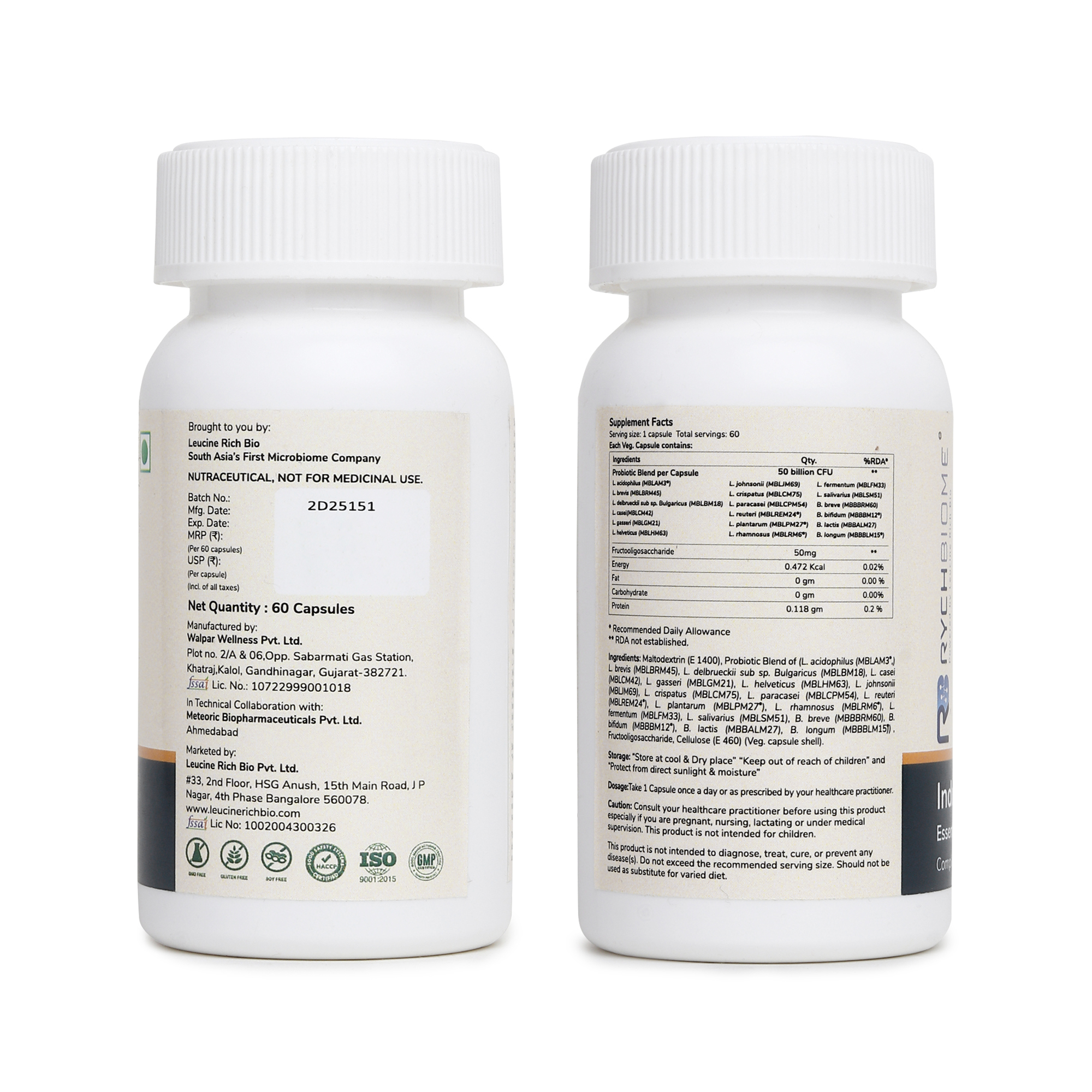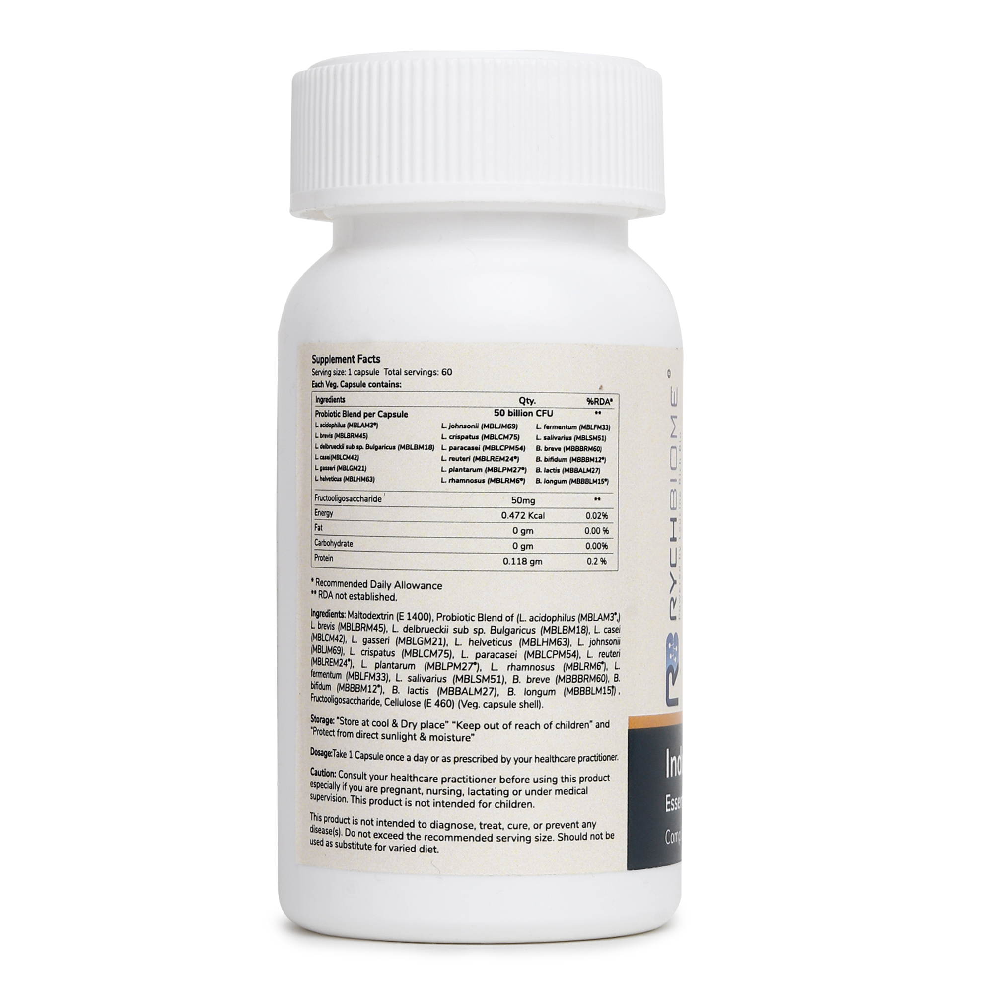 RychBiome Indus is in capsule form, with each capsule containing 50 Billion CFUs and a total of 60 Capsules in one bottle.