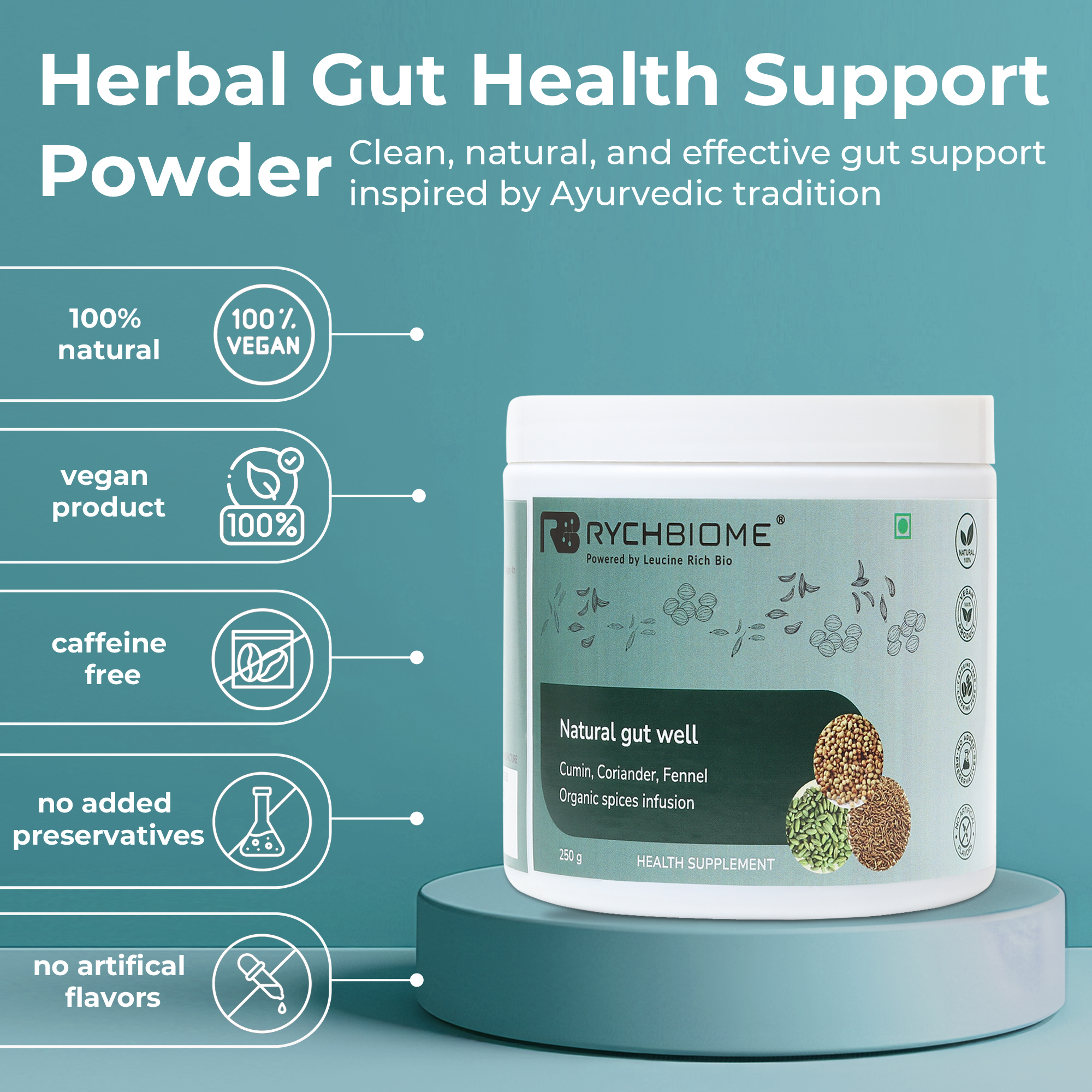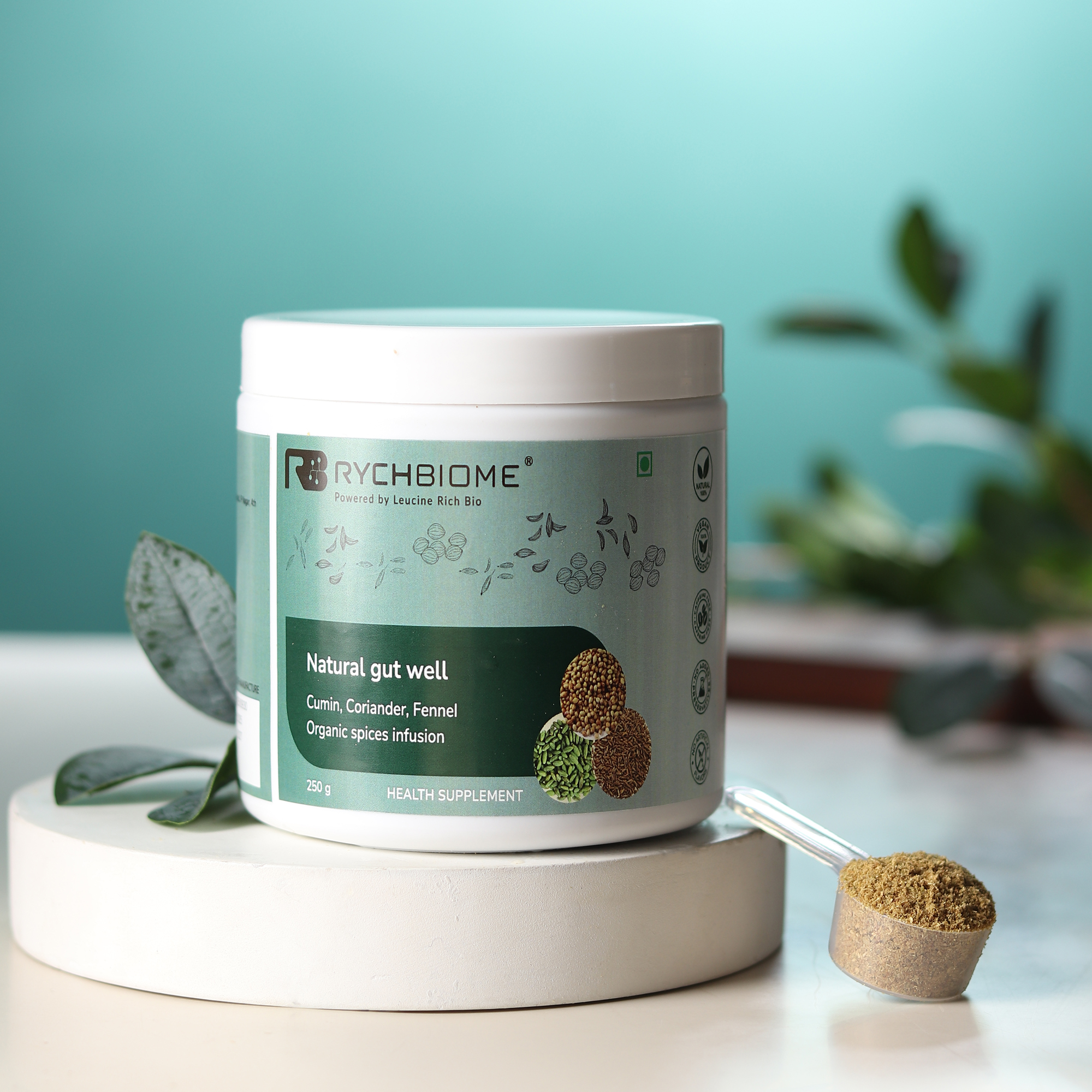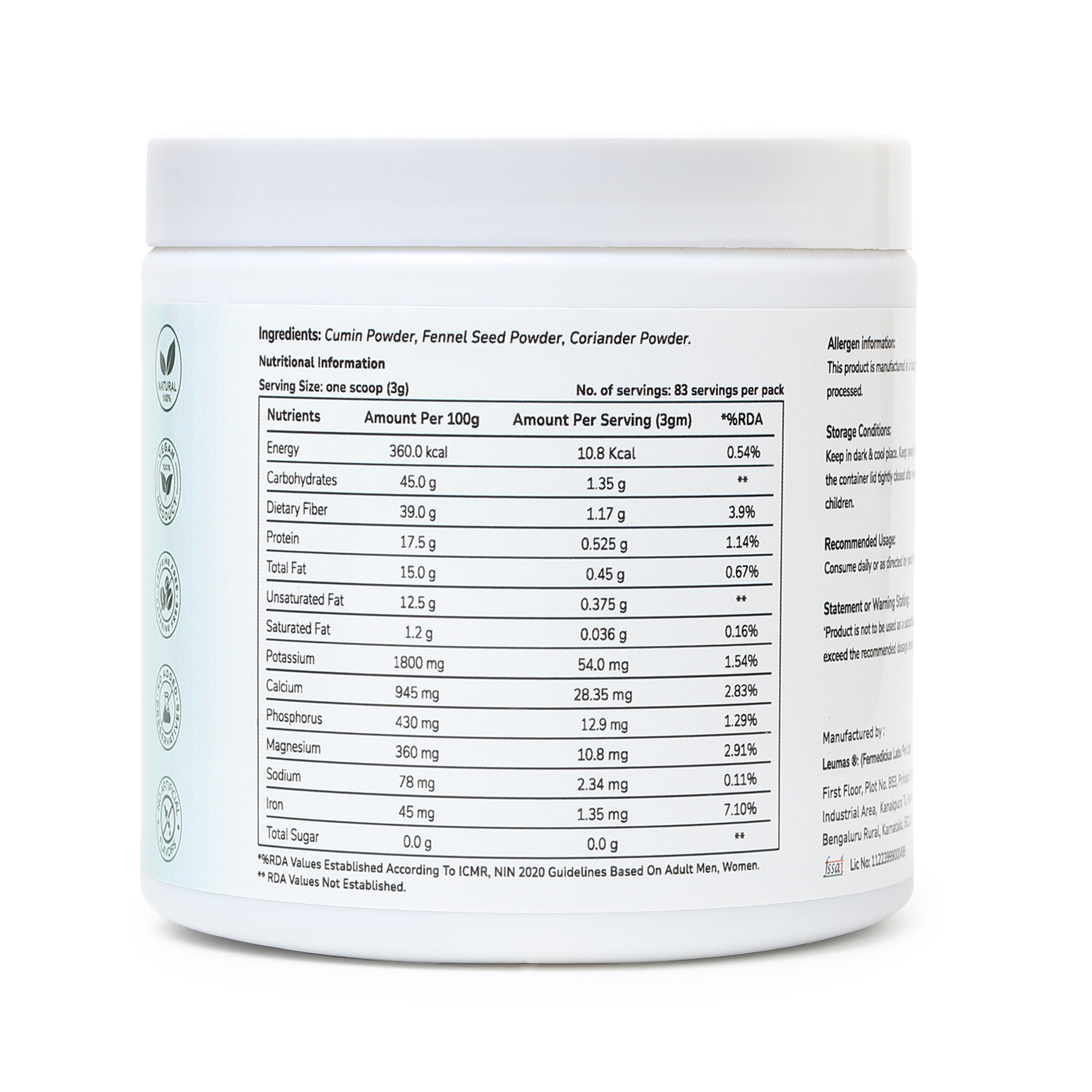 Support your daily wellness with an organic blend of Cumin Powder, Coriander Powder, and Fennel Seed Powder—traditional culinary spices commonly used in everyday meals associated with digestive comfort and gut balance. This high-fiber spice infusion is crafted by Leucine Rich Bio, South Asia’s first microbiome-focused company, with an emphasis on purity, quality, and thoughtful formulation. Made from organic-grade plant ingredients, this natural spice blend fits easily into daily diets as part of a gut-friendly lifestyle. Each serving provides dietary fiber and naturally occurring minerals, with zero added sugar, making it a clean and simple addition to everyday meals and beverages. With a mild, earthy flavor and versatile use, the blend can be mixed with warm water or added to food preparations. Produced in a certified facility using pure plant ingredients, it offers a natural, food-based way to complement everyday digestive wellness and overall wellbeing.